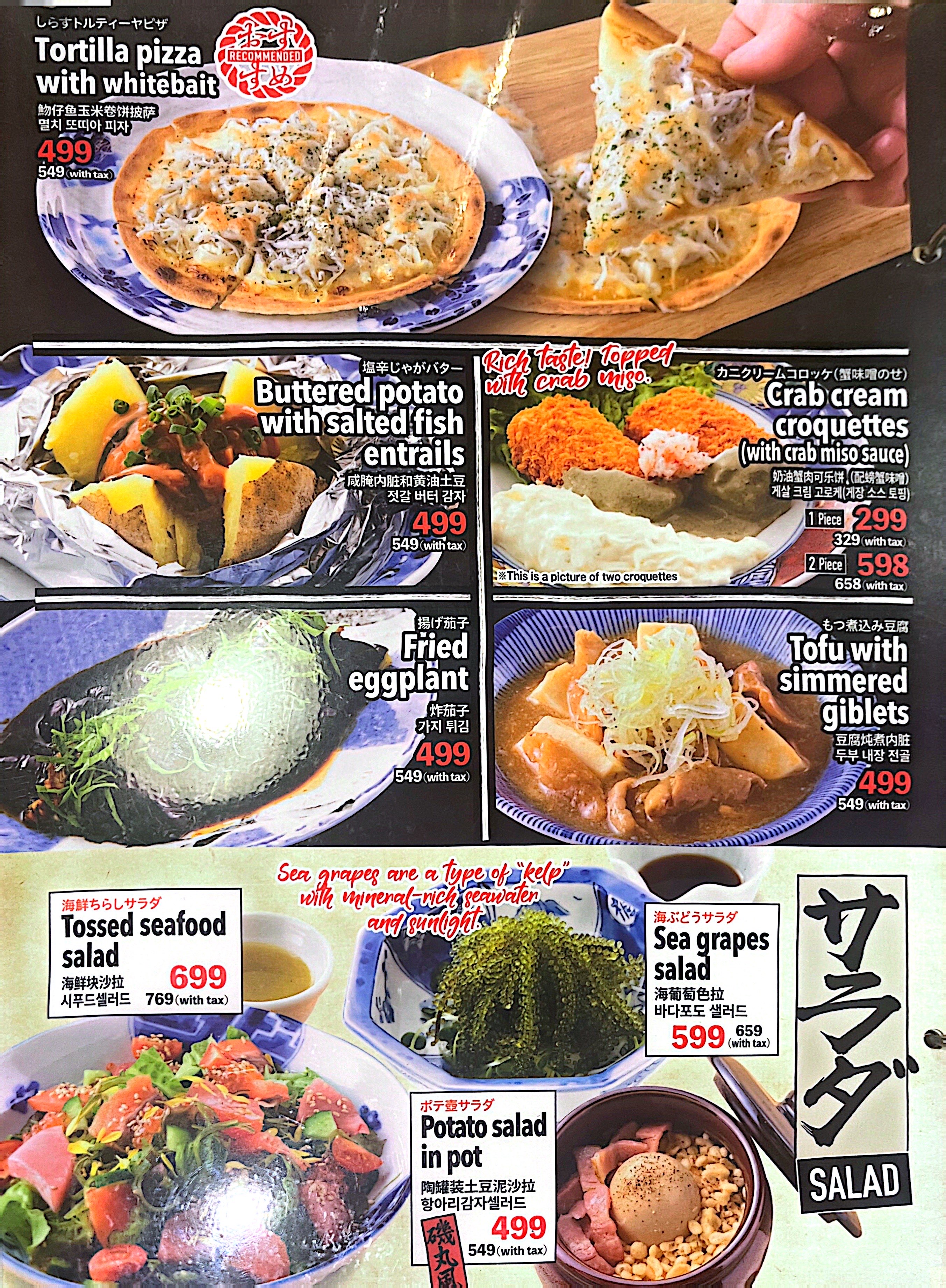 조개 - 새우 - 오징어 - 생선, 장어구이 - 스시 - 생선 + 조개 사시미 - 절임에 폰즈 소스 요리 - 튀김 카라아게 - 덮밥, 볶음밥과 라멘까지